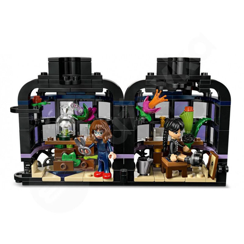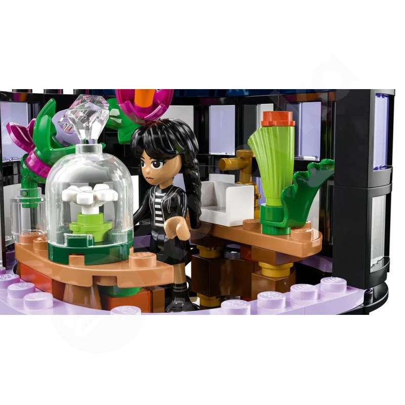 LEGO® Wednesday 76784 Černá jiřina obsahuje dvě minipanenky – Wednesday Addamsovou a profesorku Marilyn Thornhillovou – a řadu doplňků pro hraní. V učebně nechybí nábytek, knihy a detaily, které navozují atmosféru seriálu. Květina slouží nejen jako ozdobný model, ale i jako funkční „zámek“ otevírající prostor pro interaktivní hru. Stavba má 358 dílků a měří přibližně 24 cm na výšku.