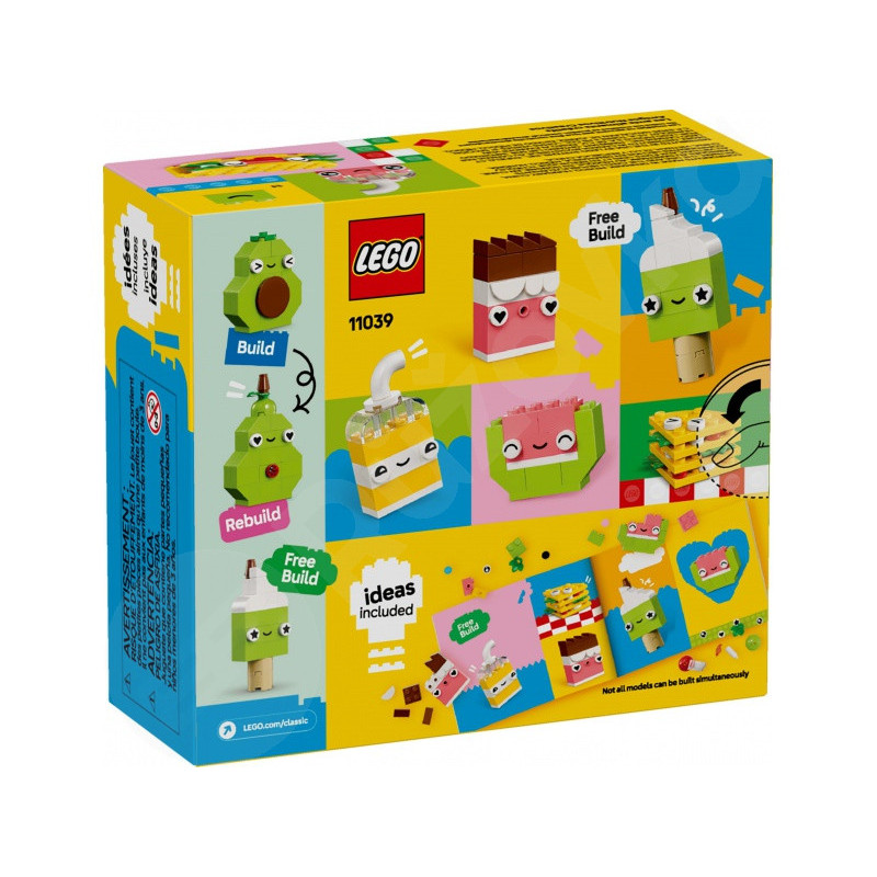 LEGO® Classic 11039 Creative Food poskytuje dokonalý začiatok sveta tvorby: jednoduché tvary, jasné farby a špeciálne prvky, ktoré oživujú detské nápady v krátkom čase. Základné modely ako cupcake, zmrzlina, avokádo a taco môžu zostaviť aj začiatočníci a potom ľahko prerobiť na tortu s posýpkou, bubble tea, hruškou alebo panini. Keď vám rastie sebavedomie, objavia sa ďalšie nápady – zelená zmrzlina, krabička džúsu, kúsok melóna, čokoládová tyčinka alebo mega sendvič. LEGO® Zároveň Classic 11039 Creative Food prirodzene trénuje jemnú motoriku, hravé učenie a schopnosť plánovať; Dieťa si vyberá farby, mení tvary, doladí výrazy a skúša nové kombinácie. LEGO® Sady v tejto sérii neobsahujú elektroniku ani nálepky, takže dôraz je kladený na čisté stavanie a opakované hranie. S jednoduchými inštrukciami je pokrok rýchly a motivujúci a každý úspech podnecuje túžbu pokračovať v tvorbe. Celá rodina si môže užívať spoločné chvíle, keď sa zdieľajú nápady, porovnávajú varianty a vytvárajú sa jedinečné kúsky, ktoré potešia na poličke a budú sa ďalej hrať.