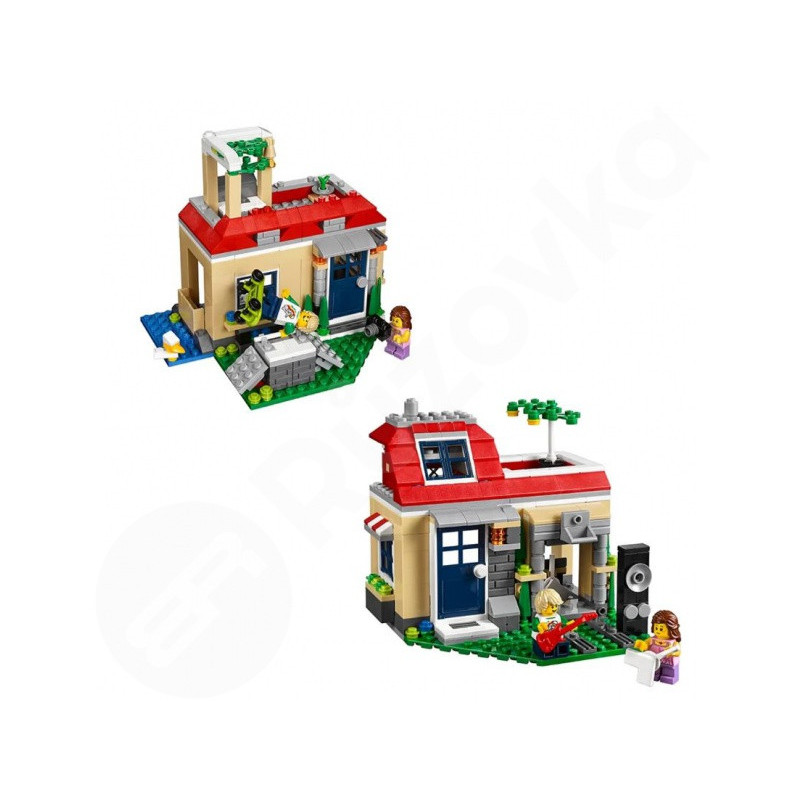 Interiér domu je plný autentických detailov, ktoré dodajú atmosféru letného leňošenia - nájdete tu gitarový zosilňovač, TV s plochou obrazovkou a pohodlnú pohovku. S novým modulárnym systémom LEGO® Creator 3v1 z júna 2017 môžete jednoducho kombinovať okná, dvere a ďalšie časti a vytvoriť si vlastnú verziu vášho letného domu a dokonca pridať strešný bazén alebo záhradu!