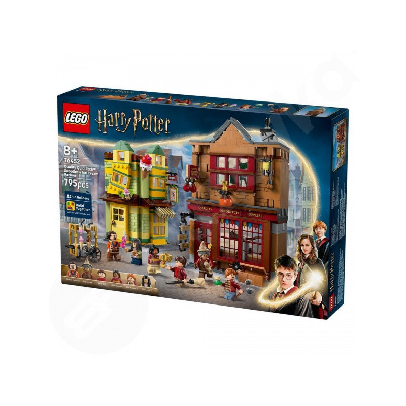 LEGO® LEGO® Harry Potter™ 76452 Premium Quidditch & Ice Cream Shop zavedie fanúšikov do srdca Čarodejníckej štvrte, kde ožívajú známe obchody z čarodejníckeho sveta. Zostaviteľný model obsahuje dve detailne prepracované budovy: prémiový metlobalový obchod a obľúbenú zmrzlináreň Floriana Fortescueho. Každá budova je plná autentických detailov – od metlobalových potrieb a vystavených metiel až po vitrínu plnú čarovných zmrzlinových pohárov. LEGO® stavebnica obsahuje aj šesť minifigúrok vrátane Harryho Pottera, Olivera Wooda a pána Fortescuea, vďaka čomu je ideálnou stavebnicou pre zberateľov aj malých fanúšikov.