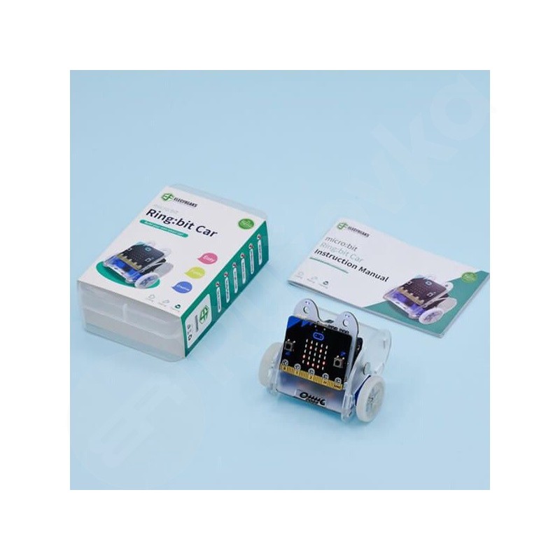 Ring:bit Kit V2 micro car je malý Kutilský inteligentný pohonný mikroauto BBC mikro:bit a ELECFREAKS Ring:bit. Základné mikroauto Ring:bit sa dá ľahko naprogramovať na autonómnu jazdu s diaľkovým ovládaním a dokonca na vytváranie dúhových svetlometov. Stačí pridať jednu z mnohých dostupných rozšírení a vaše vozidlo Ring:bit Car dokáže ďalšie veci, ako sleduje línie a svetlá, vyhýba sa prekážkam, kreslí a ďalšie!