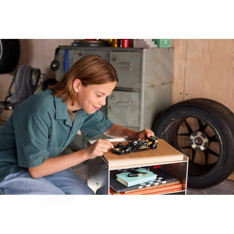 Áno, stavebnica používa štandardný systém LEGO®, takže je plne kompatibilný s inými setmi Speed Champions aj s bežnými kockami. Minifigúrky môžete vybaviť štandardnými doplnkami a jednoducho integrovať auto do vlastnej garáže, boxovej uličky alebo pretekárskej scény z jinýSety. Môžete rozšíriť svoju zbierku a postaviť väčšie okruhy a sklad.
